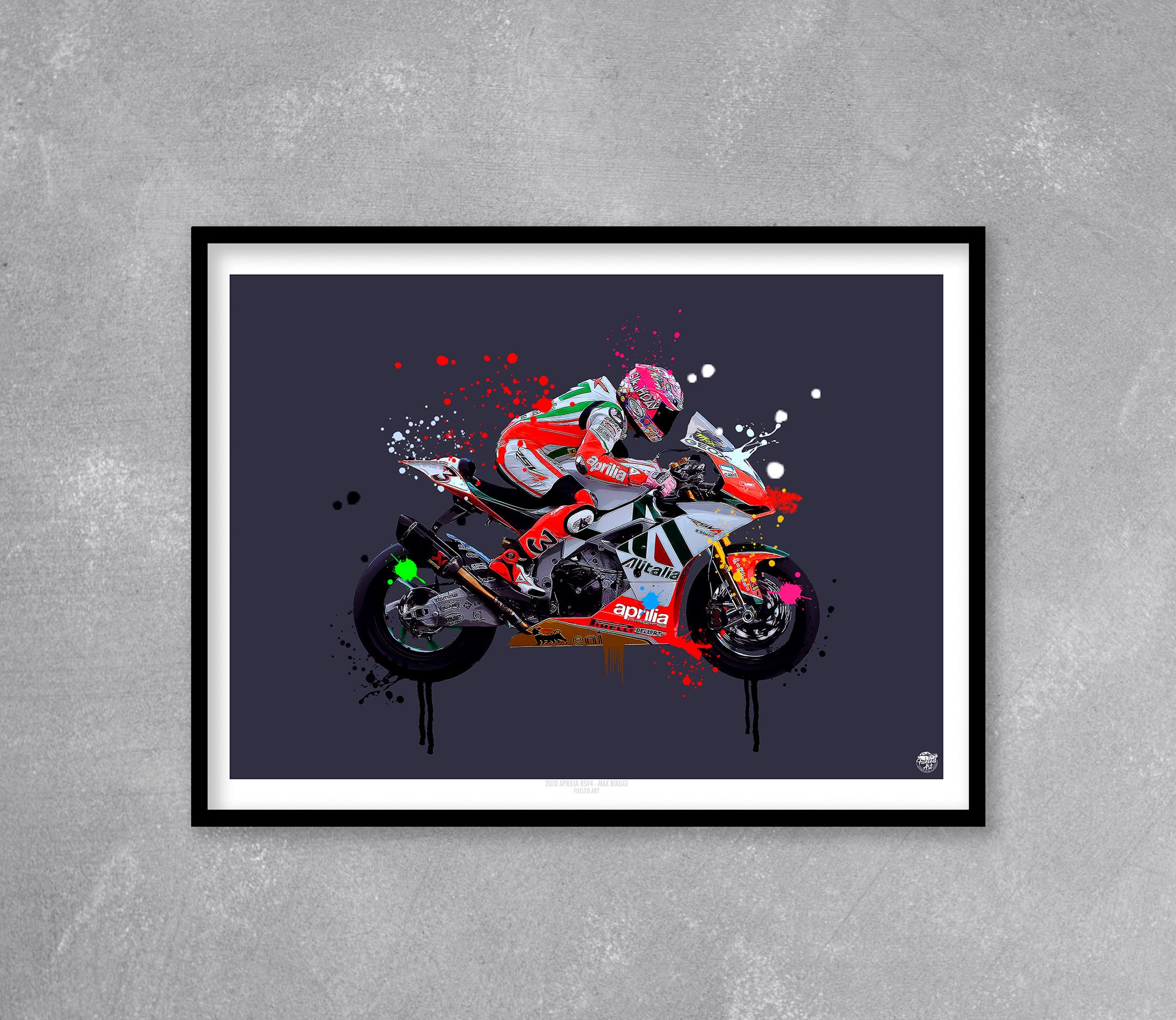 Channel the raw energy of Superbike racing with this bold art print capturing Max Biaggi’s 2010 Aprilia RSV4 — the bike he rode to become World Superbike Champion, marking a historic milestone as the first Italian to win the title on an RSV4.