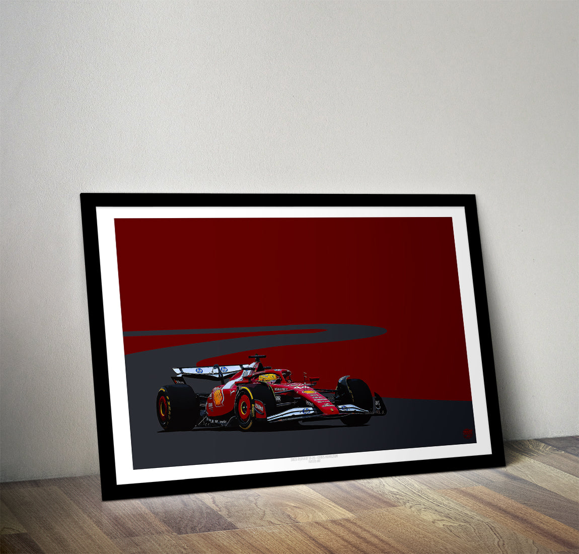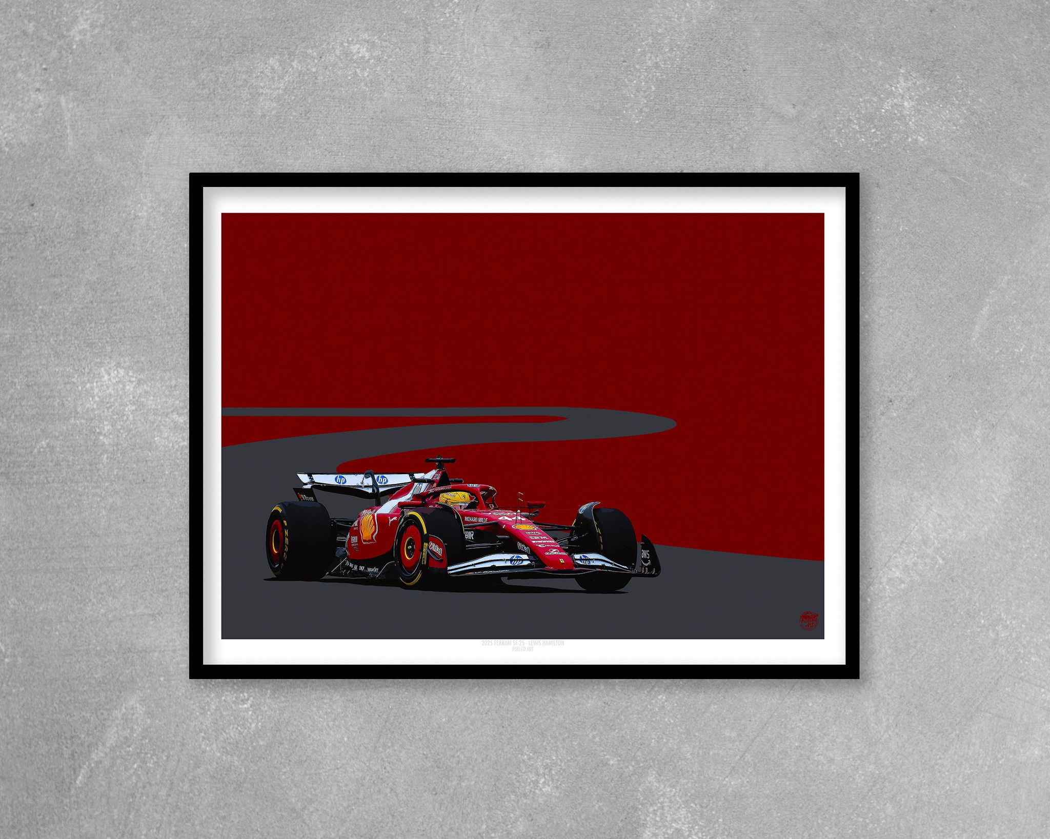 Introducing the Lewis Hamilton Ferrari SF-25 Art Print by Fueled.art, commemorating Hamilton's historic transition to Scuderia Ferrari in 2025. This artwork captures the SF-25 in dynamic motion, with Hamilton at the helm, as it navigates through Fueled.art's signature track scene.