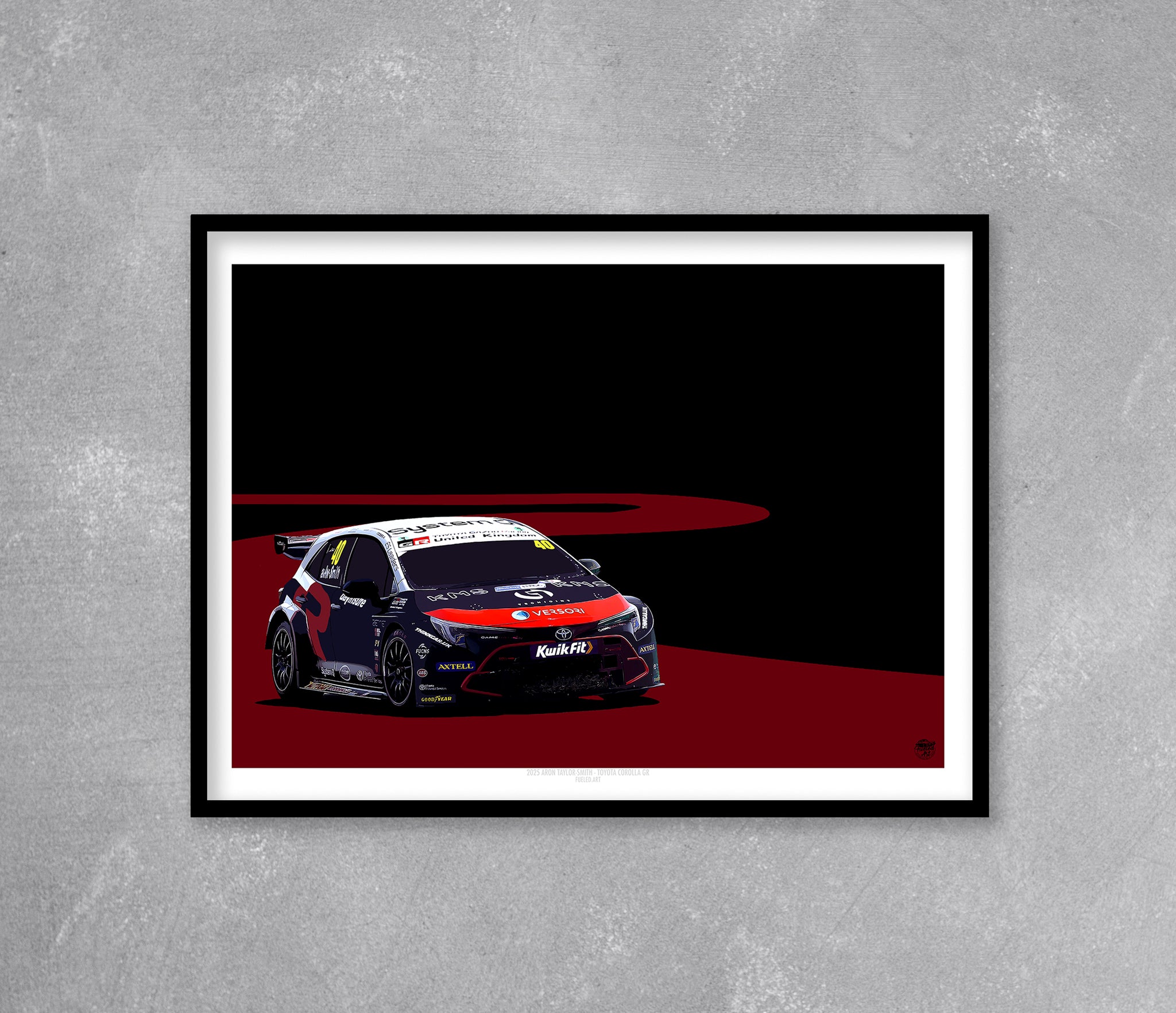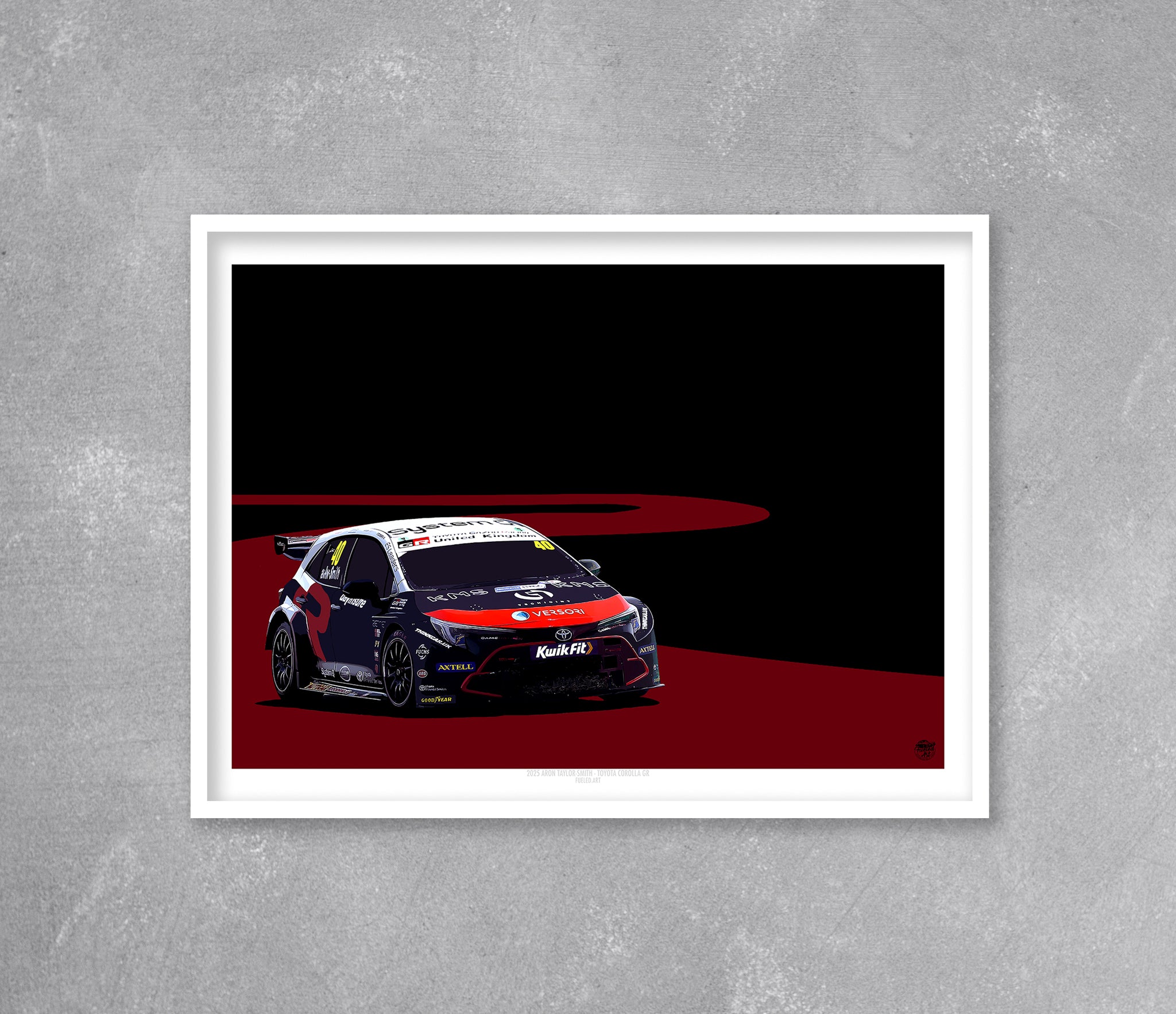 Celebrate modern British touring car racing with this high-impact art print featuring Árón Taylor-Smith’s 2025 BTCC Toyota Corolla GR Sport. The Corolla’s sharp, aggressive lines are brought to life cornering on Fueled.art’s signature track design, conveying speed, intensity, and race-day drama.